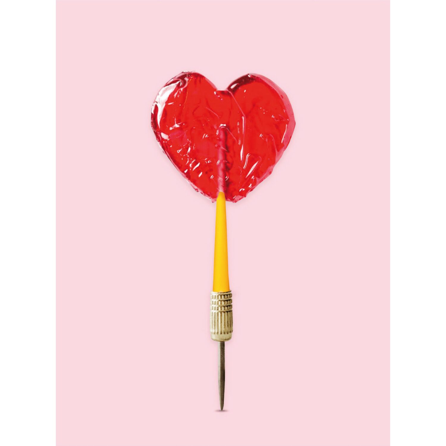 El corazón de piruleta, atravesado por un dardo, revela el doble filo del amor: dulce y peligroso, atractivo y vulnerable.