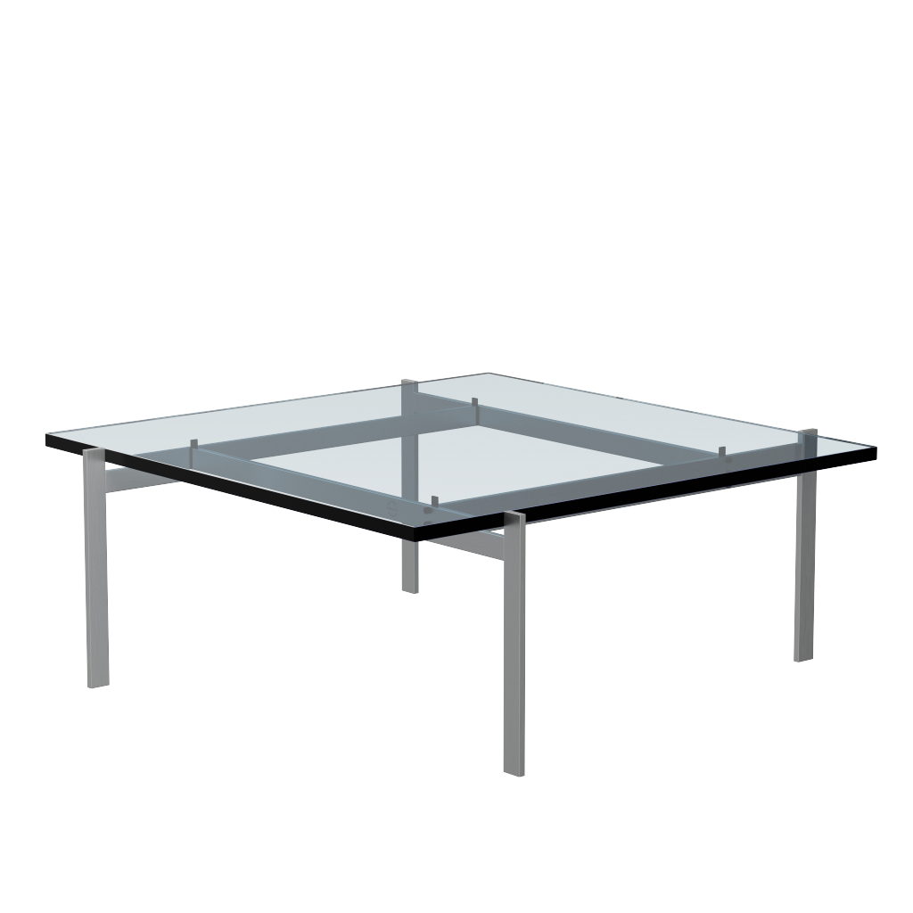 PK61™ Coffee Table con sobre de vidrio Glass / Float y estructura de acero Brushed Spring Steel – Matt. Diseño de Poul Kjærholm (1956). Mesa de centro ligera, precisa y atemporal para interiores contemporáneos.