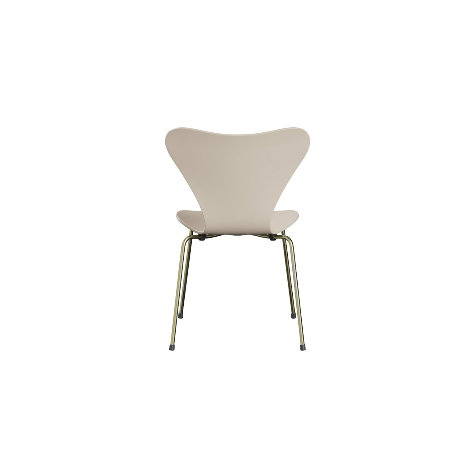 Edición aniversario del modelo 3107, con asiento en chapa moldeada beige cálido y patas de acero cromado.