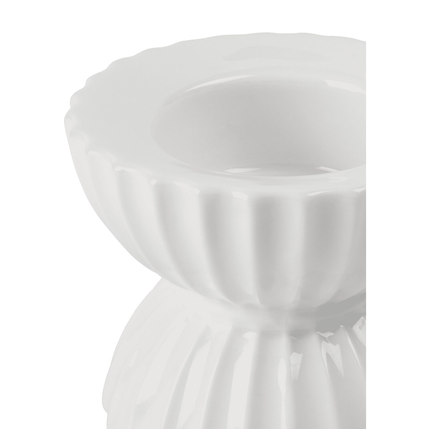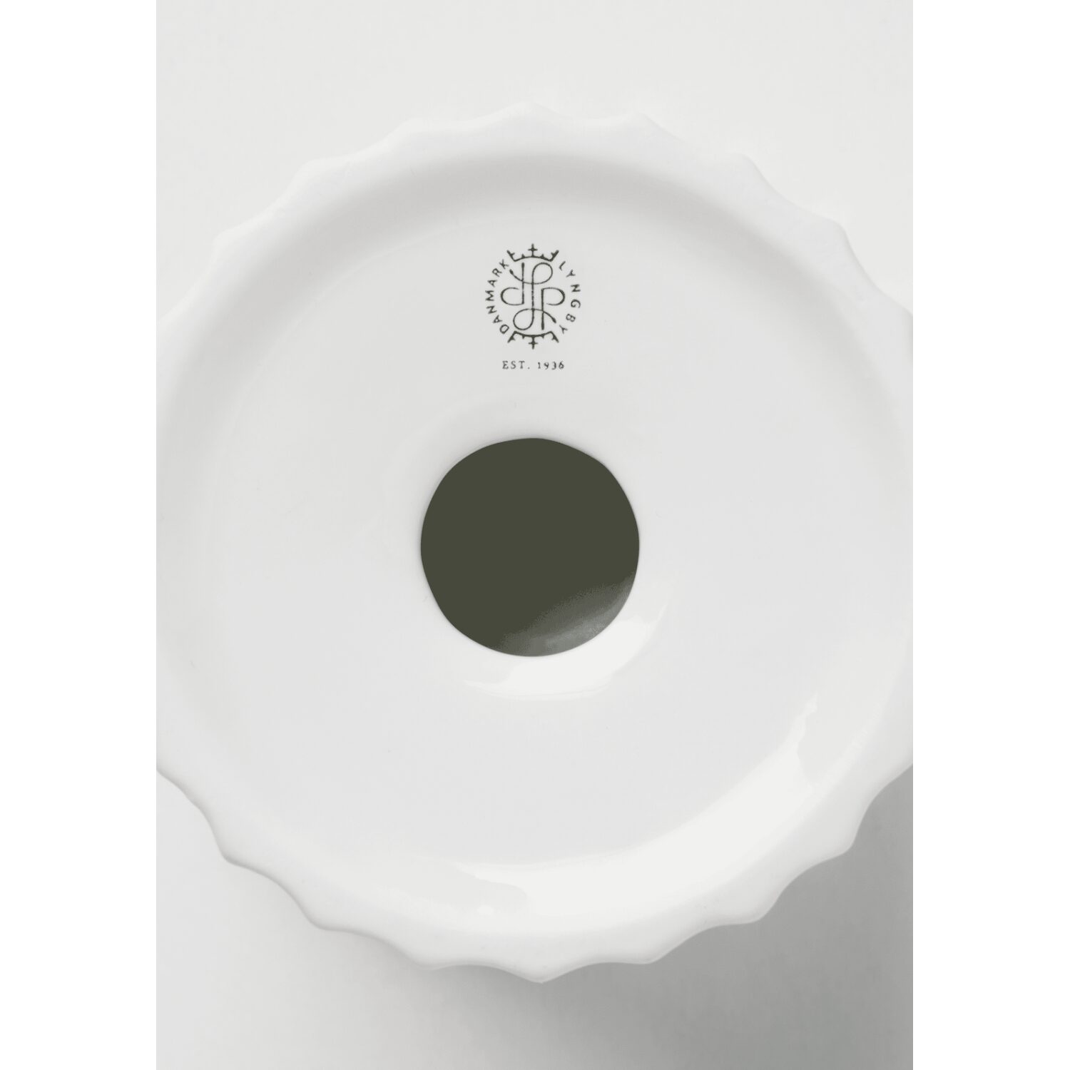 Su estructura de porcelana blanca presenta las icónicas acanaladuras de Lyngby, símbolo de la marca desde 1936, reinterpretadas con una presencia contemporánea que une lo clásico y lo moderno.
