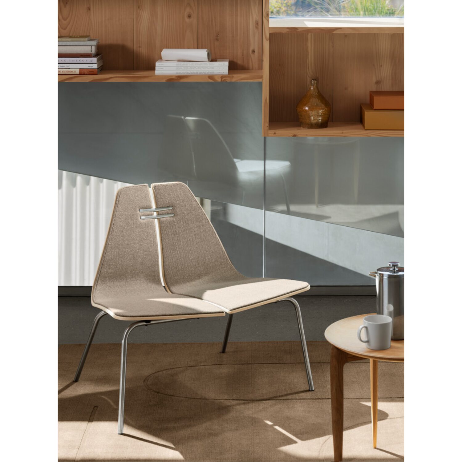 Las patas, finas y ligeramente inclinadas, refuerzan la ligereza del conjunto, generando una sensación de fluidez visual. Esta combinación de elementos da como resultado una pieza armoniosa, pensada para durar en el tiempo tanto a nivel funcional como estético.