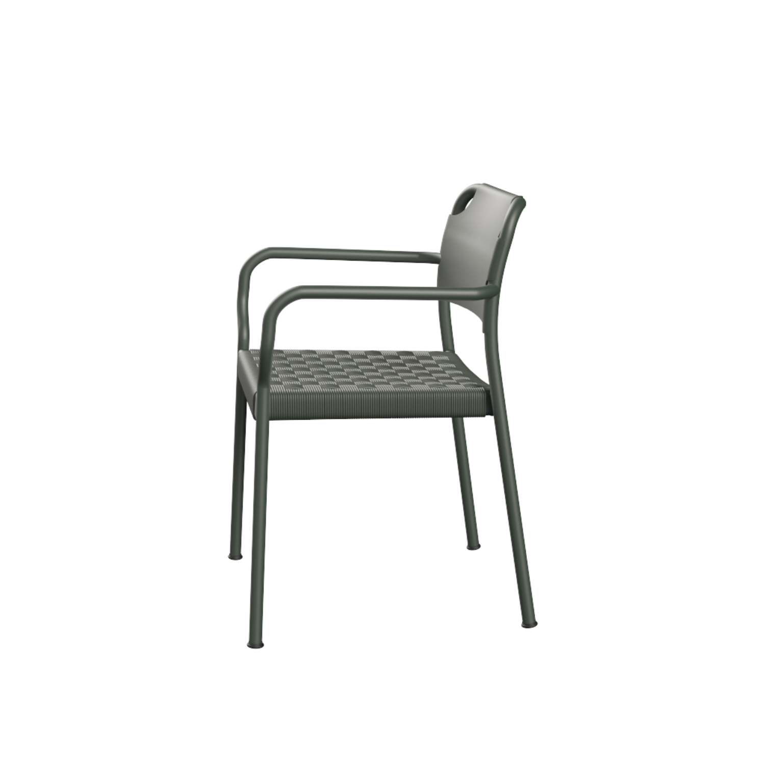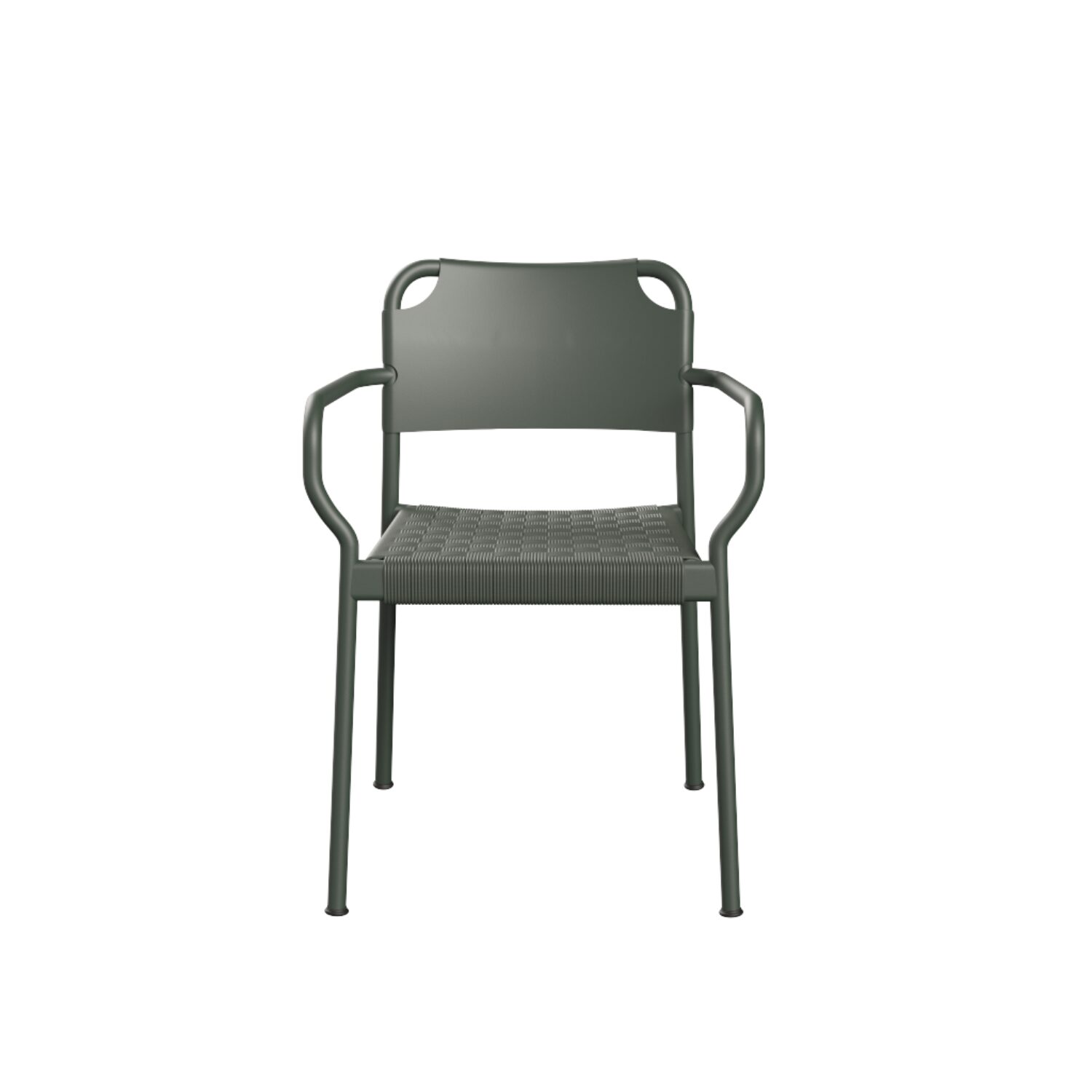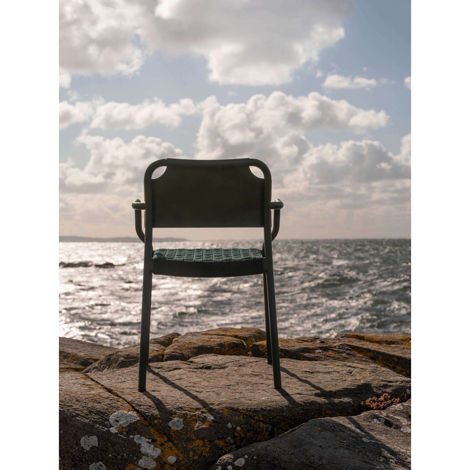 Silla de exterior con brazos en aluminio con acabado Hunter Green y asiento en cordón de poliéster trenzado, ligera, resistente y apilable.