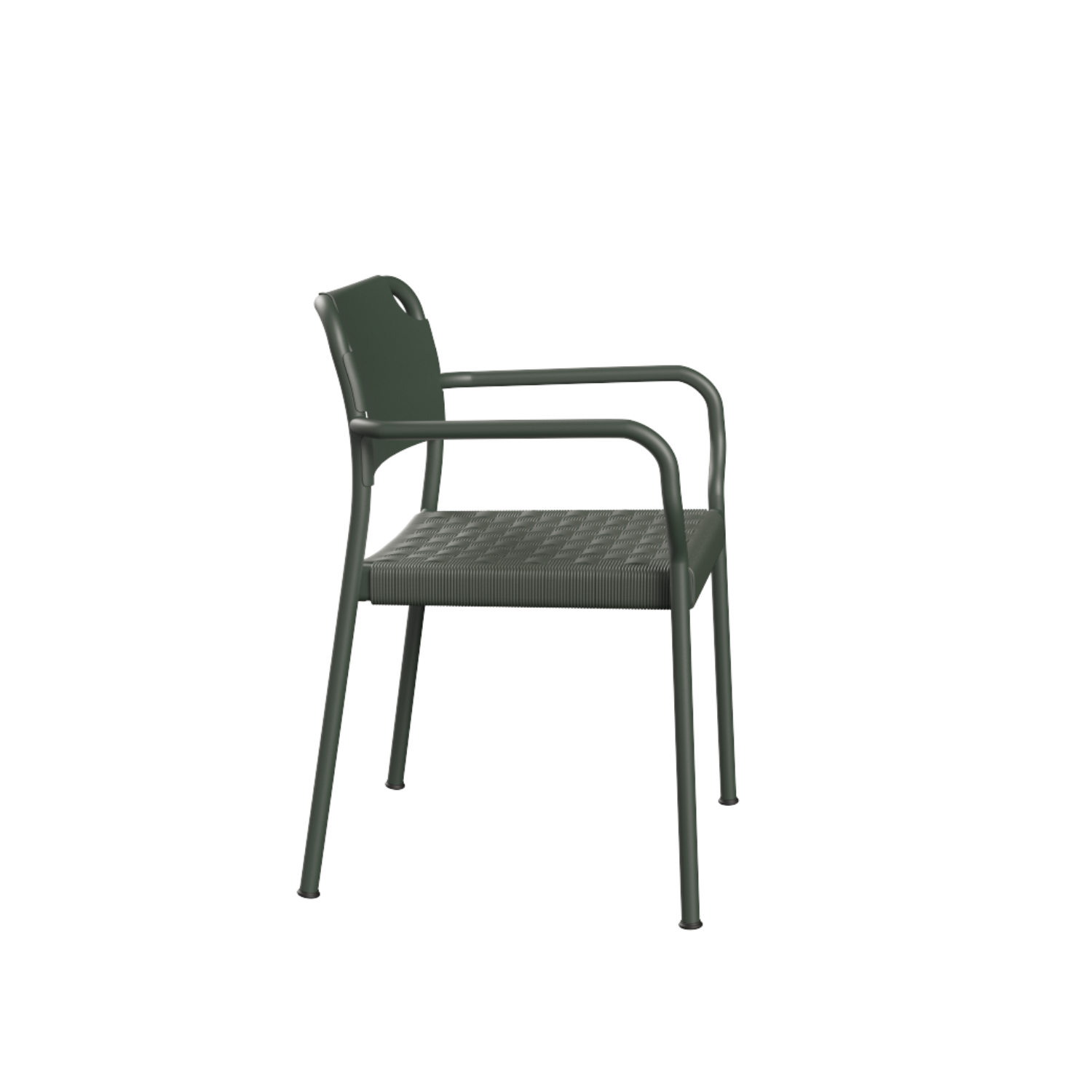 Este acabado presenta una estructura en aluminio con recubrimiento en polvo en color Hunter Green, combinada con un asiento en cordón de poliéster trenzado en el mismo tono. Esta combinación aporta resistencia a las condiciones exteriores, ligereza visual y una textura que introduce calidez dentro de un lenguaje formal contenido.