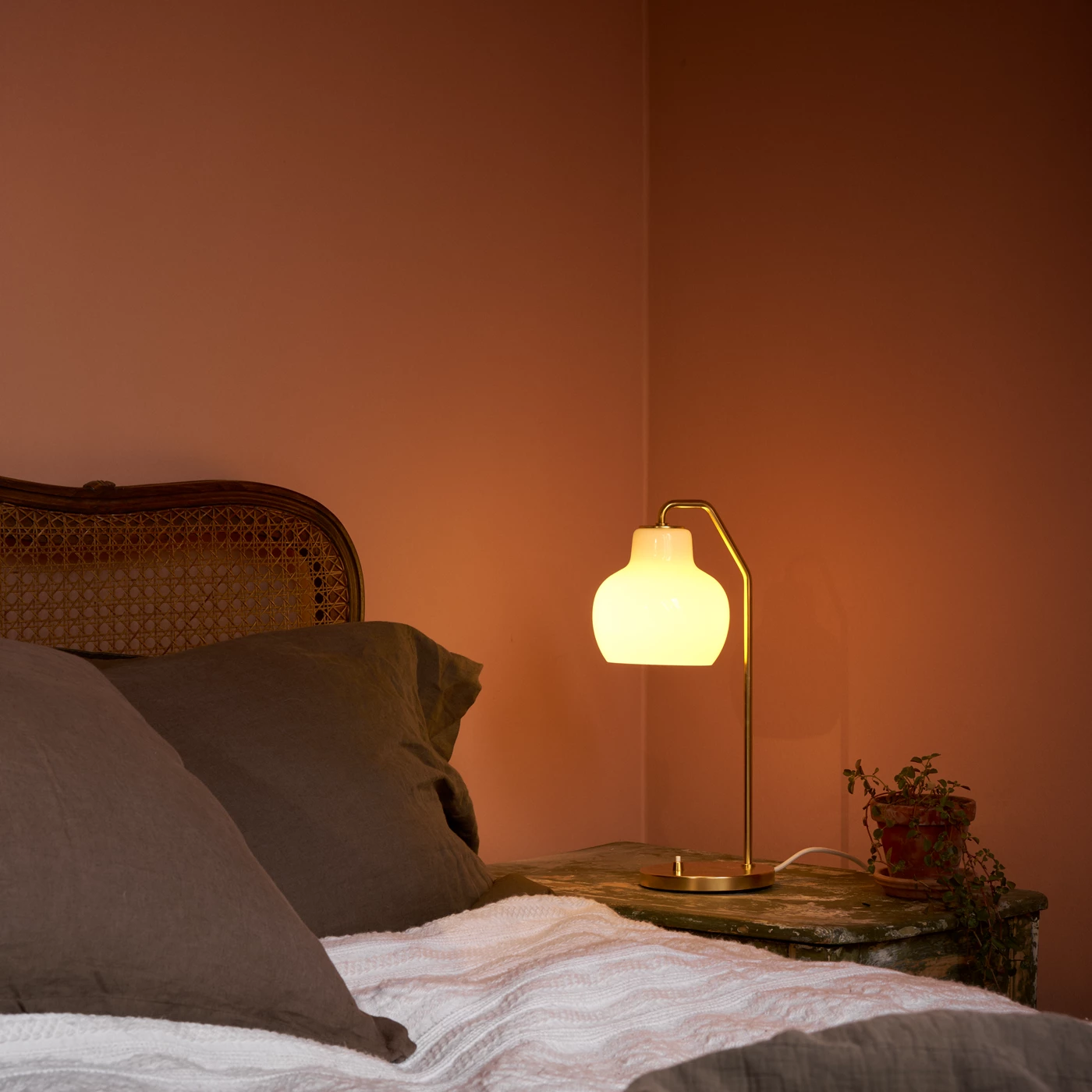 La VL Ring Crown Table Lamp ofrece una luz directa hacia abajo y difusa en el entorno, gracias a su pantalla de vidrio opalino brillante soplado a mano. El interior blanco de tres capas suaviza el flujo luminoso, eliminando deslumbramientos y creando una atmósfera cálida, equilibrada y envolvente.