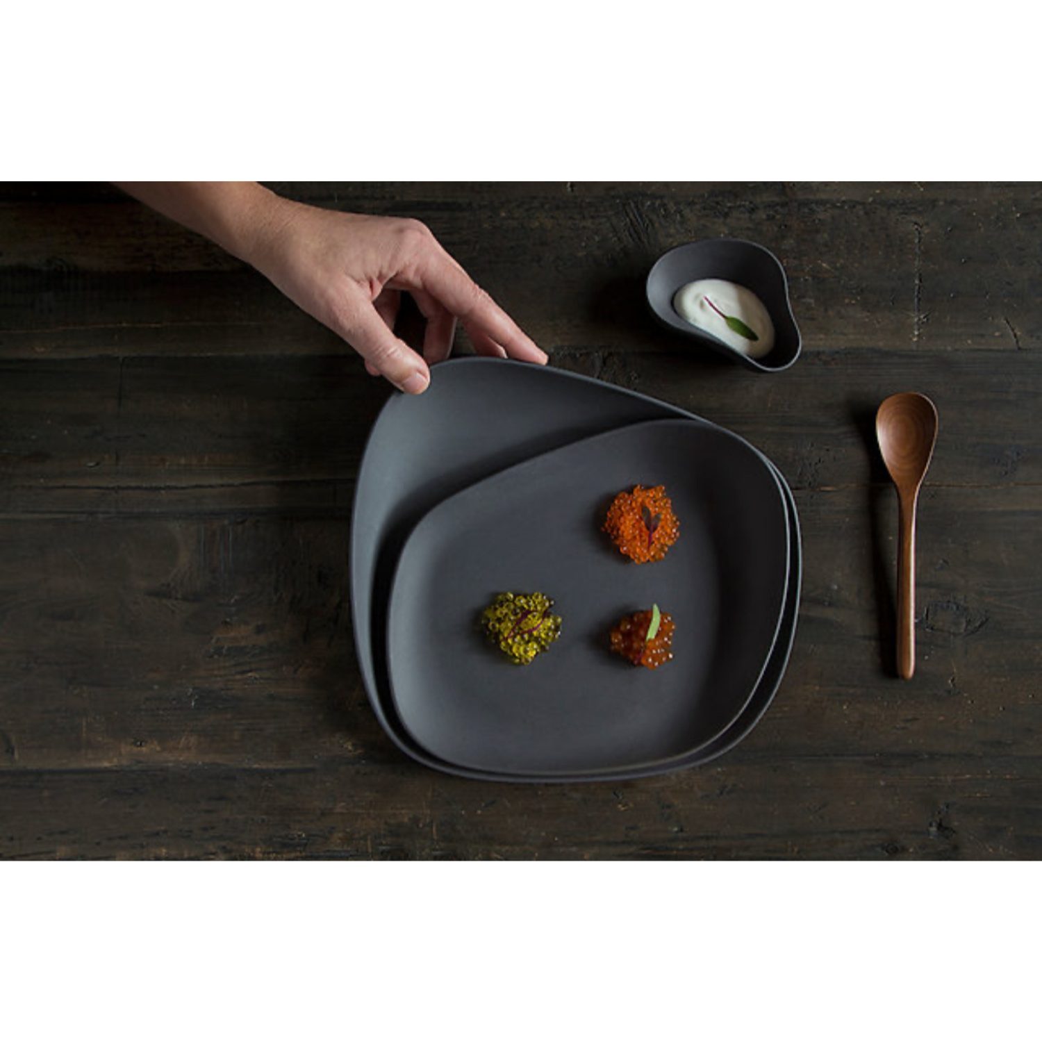 Con su acabado en porcelana negra mate biscuit (sin esmaltar), aporta un contraste elegante y contemporáneo a la mesa, siendo una pieza ideal para quienes buscan un estilo sofisticado y atrevido en la presentación gastronómica.